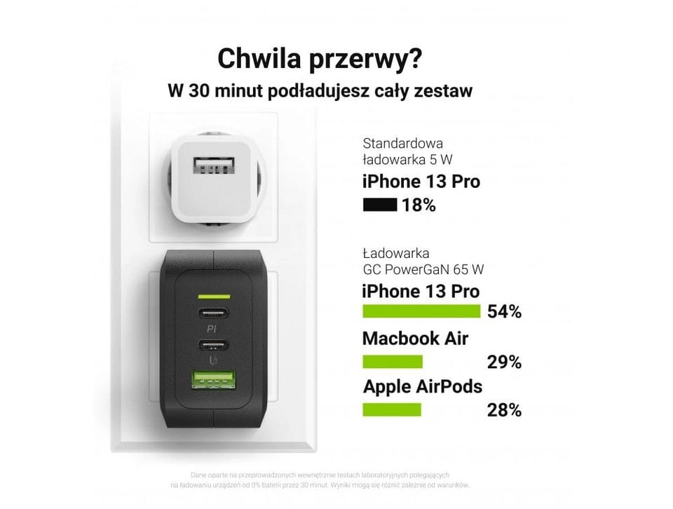 - GC PowerGaN will charge an ultrabook, tablet and phone at the same time thanks to the power of 65W (ports: 2x USB-C PD and 1x USB-A QC 3.0).