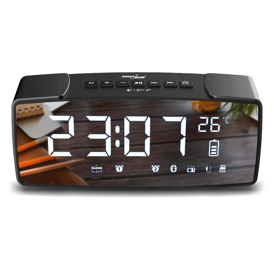 GreenBlue GB200 to nowoczesny radiobudzik wyposażony w duży lustrzany ekran, dzięki czemu idealnie wkomponuje się w każde wnętrze, niezależnie czy urządzone jest w stylu klasycznym lub nowoczesnym. Duże cyfry zapewniają czytelność nawet z większej odległości, a wbudowany czujnik pozwala na wyświetlanie temperatury otoczenia.