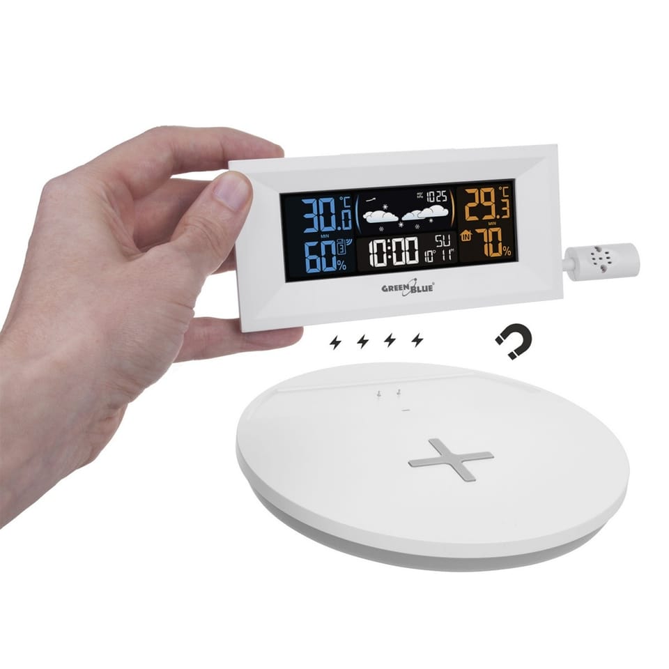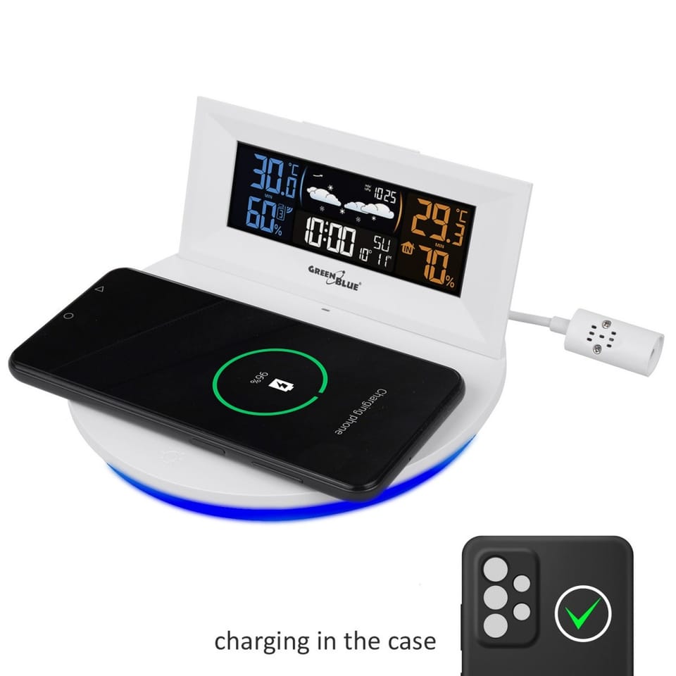 GreenBlue Wireless Weather Station with Wireless/Inductive Charger, Clock, Alarm, Calendar, External Sensor, GB213