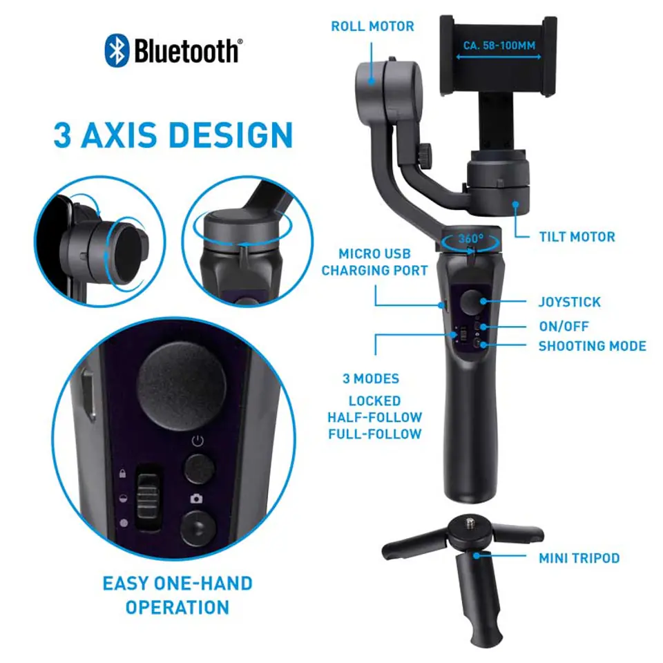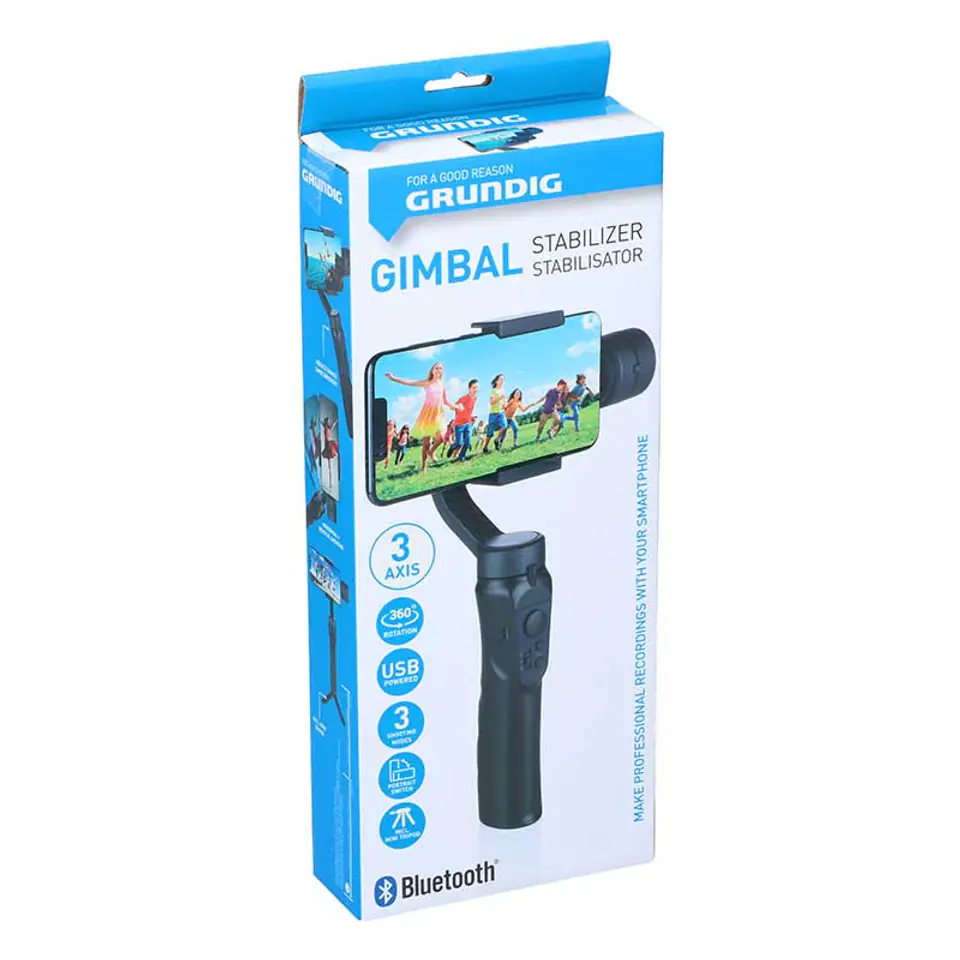 An indispensable gadget for sports action videos, funny tiktoks, YouTube recordings, delayed videos, time-lapse, panoramic photos, transitions and other dynamic shots. This Grundig Gimbal stabilizer keeps your phone in the right position, no matter what movements you make. The stabilizer can be charged using the included micro USB cable. The holder fits smartphones with a width of 58 to 100 millimeters. A mini tripod is included, so you can film and capture all kinds of scenes yourself. The smartphone can be used both vertically and horizontally, as well as rotated 360 degrees. The large joystick in the middle makes the gimbal easy and quick to operate with one hand. Automatically adjusts from top/bottom/left/right. The stabilizer has 3 scene settings: fixed, half-moving or full-moving. You connect it to Bluetooth, so you can control the creation of videos and photos. Features:- Gimbal stabilizer for professional shooting- 360 degree rotation- 3 axis- Smartphone holder from 58...100mm- Quick manual adjustment- Automatic adjustment from top, bottom, left, right- Vertical lifting with hand gestures- One-Key Back to starting position- Scene mode: lock, half-sequence, full sequence- Bluetooth function- USB charging function- On/off switch- USB charging cable and mini screw stand includedSpecifications:- Operating voltage: 3.7 V-, 2200 mAh- Frequency range: 2402...2480 MHz- Bluetooth version: 4.2- Working time: approx. 4 h- Color: black- Weight: 400 g- Dimensions (LxWxH): 291x120x50 mm Scope of delivery:- Smartphone holder in gimbal- USB charging cable- Mini tripod- User manual