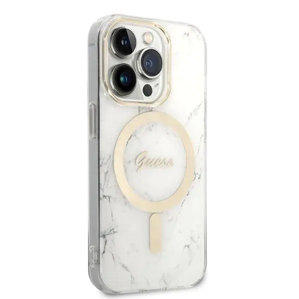 Unusual visual effects are provided by gold accessories in the form of a frame around the camera and the emblem of the Guess fashion house. Thanks to the use of gold accessories, the case acquires a warmer character. For the best convenience of the user, the case has been equipped with a magnetic ring compatible with MagSafe technology for fast, wireless charging.