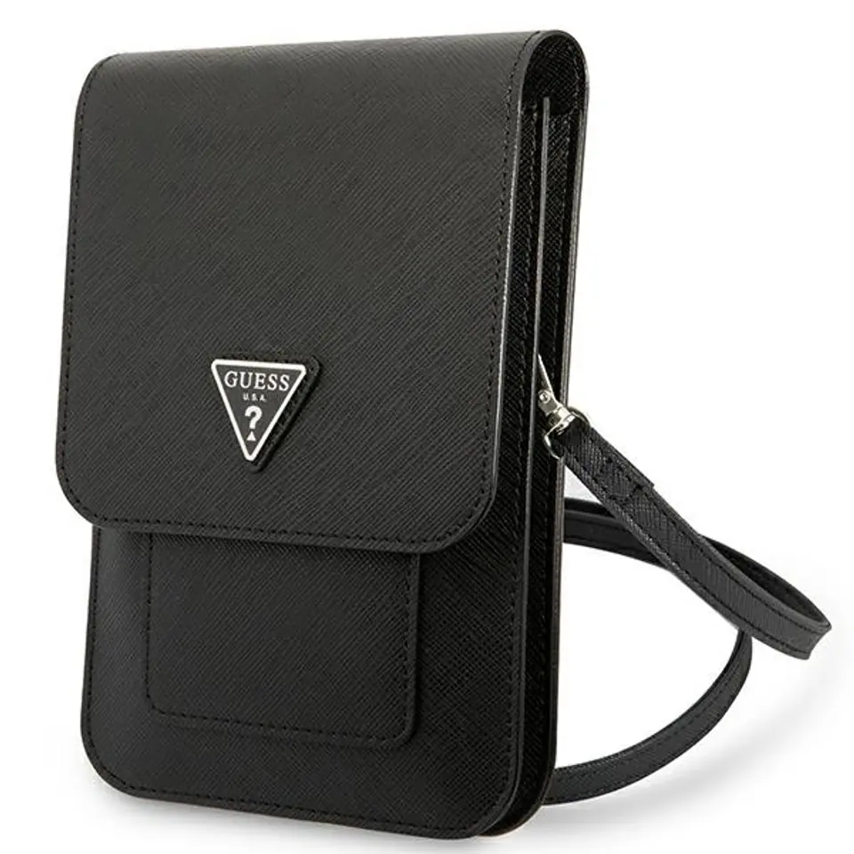 The branded smartphone bag is made of eco-leather with a luxurious Saffiano texture, closed with a magnetic clip, finished with a triangular Guess logo. It has a detachable shoulder strap, four card/document pockets and two smartphone compartments.