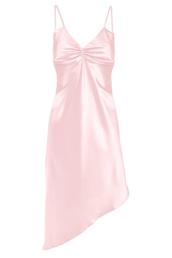 HALKA GŁADKA Z TRÓJKĄTNYM, DELIKATNIE MARSZCZONYM DEKOLTEM. RAMIĄCZKA SĄ CIENKIE I REGULOWANE. DÓŁ HALKI JEST ASYMETRYCZNY, Z JEDNEJ STRONY BOK JEST DŁUŻSZY.