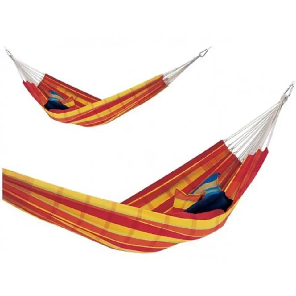 Double hammock Barbados - Papaya Barbados is a combination of vivid colors and extremely soft and delicate to the touch, yet durable yarn. This model can be successfully classified as a two-person hammock due to the large lying area and lifting capacity up to 200kg. AMAZONAS Amazonas Hängematten GmbH is a German company producing original Brazilian hammocks, swings, carriers and stands since 1995. It has its own production facility in northeastern Brazil, which is a world-famous hammock production center. For many years, AMAZONAS hammocks have been handmade in a traditional way by native Brazilians. Based on experience and careful workmanship, we receive products of the highest quality and in unique designs. Very aesthetic characteristics, high quality of workmanship, extremely nice, comfortable and durable material, ideal for hanging both in the garden and in the room, a large lying area and a lifting capacity of up to 200 kg allows it to be used by two people at the same time Accessories for hanging a hammock are available in our store (they are not included in the product). Technical Specifications Lying area: about 230 x 150 cm total length: about 340 cm Product weight: about 1.8 kg Maximum load: up to 200 kg Recommended mounting methods with a wall hook with an EASY+ carabiner (available in our store) using a Smartrope rope for hanging hammocks on trees (available in our store) AZ-1018200