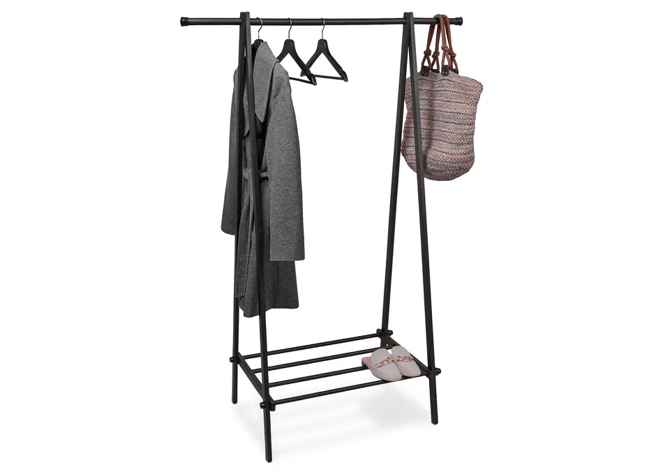 A standing hanger is a practical way to store clothes and shoes, which is why it will work as a piece of equipment for any wardrobe, bedroom or hallway in your home or apartment.