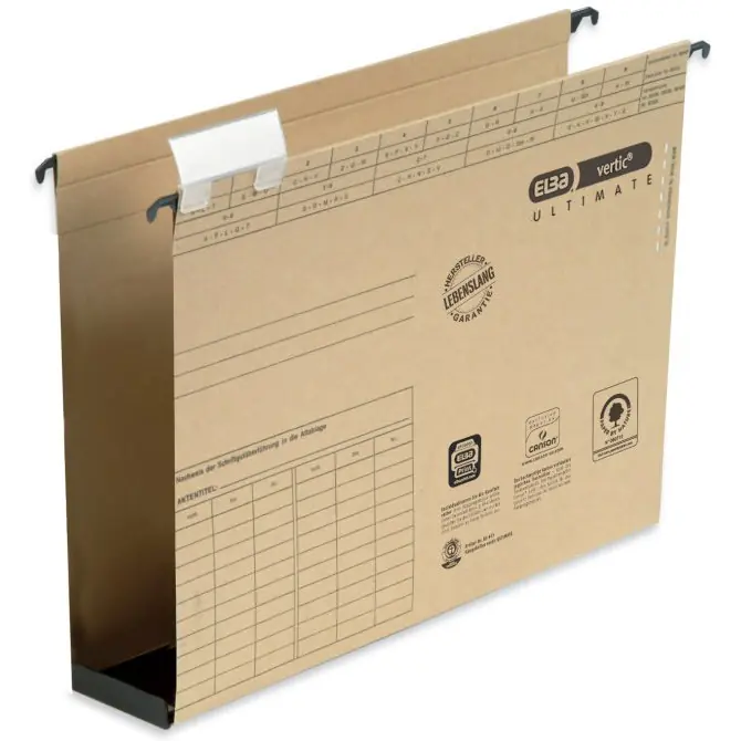 Hanging folders with widened bottom VERTIC ULTIMATE_- made of strong CANSON cardboard with a weight of 320 g / m__- plastic insert at the bottom of the briefcase with side ogranicznikami_ - increased capacity and durable ość_- sliding signboard with a replaceable label opisową_- two pairs of cuts for workbook strips E27592_- packaging - 25 sztuk_- lifetime gwarancja_- sales unit 1 package
