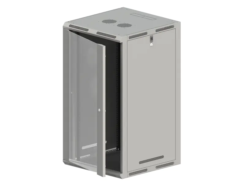 19" hanging-standing cabinets for self-assembly, designed for indoor use, available in 3 depths and 6 usable heights, with glass doors.