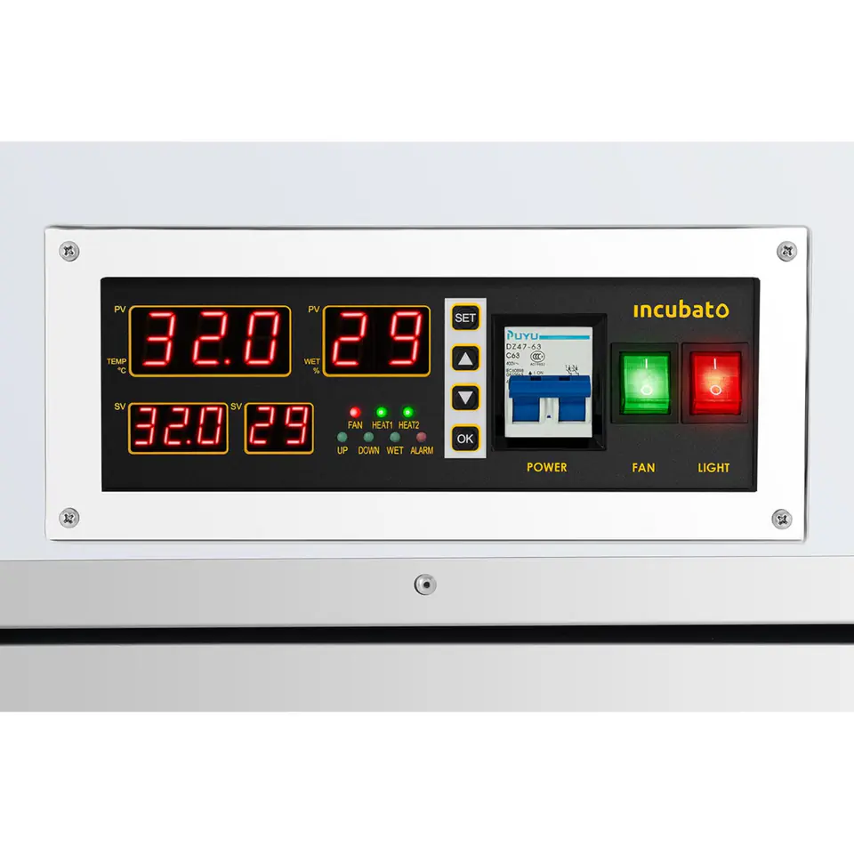 The device is equipped with a 400 W motor and a control panel with a display that allows you to control the process parameters. The incubator has automatic control of conditions in the chamber, egg rotation system and setting optimal humidity and temperature levels in the range of 30 - 39.5C. The set includes an ovoscope to control the development of embryos.