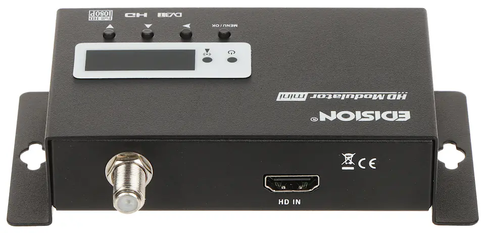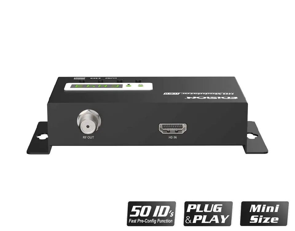 Digital single FULL HIGH DEFINITION modulator in mini size. With one input, the modulator can convert HDMI signals (e.g. from satellite receivers, PCs, notebooks, surveillance cameras, DVD/Blu-ray players, etc.) to DVB-T/MPEG4, up to FULL HIGH DEFINITION in the VHF/UHF band. Simple and quick configuration with ID Pre-Config function, making programming very simple and at the same time saving space with a very compact size, the installation of the modulator is possible even with minimal space.