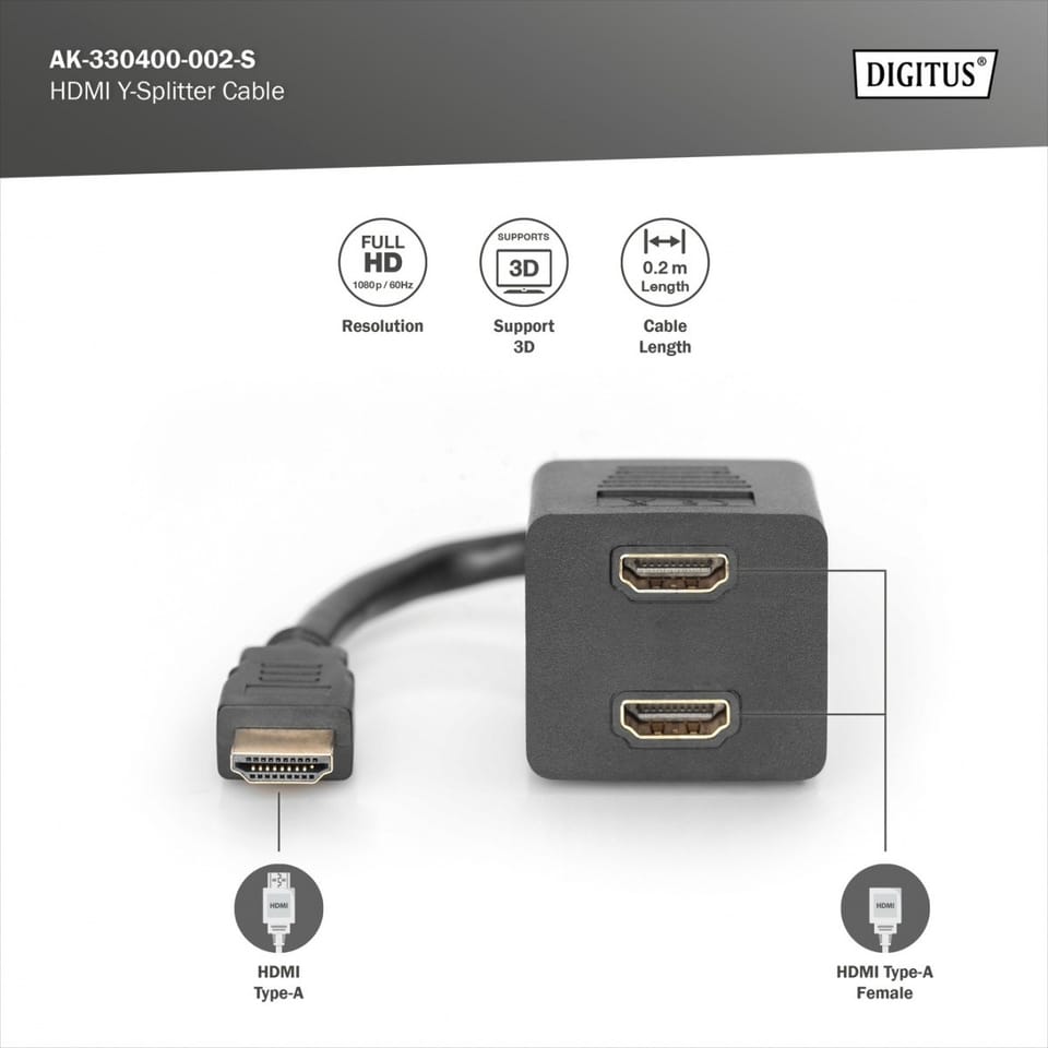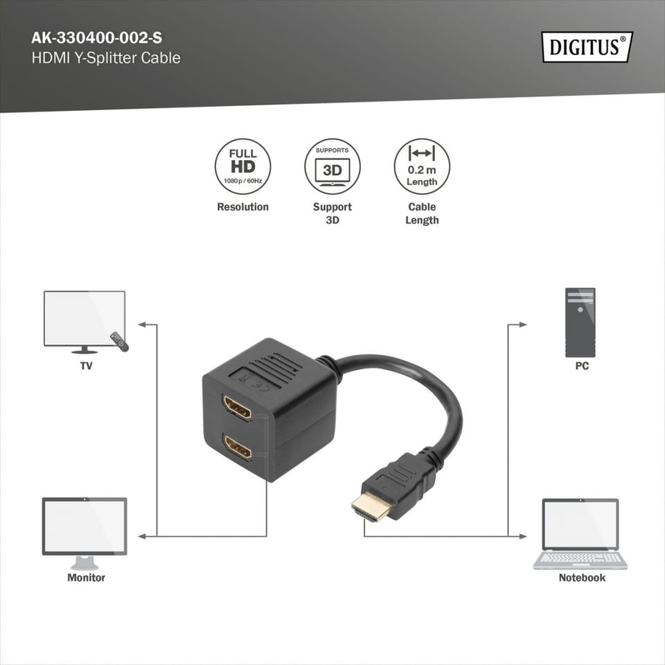 The passive Full HD (1080p) signal transmission cable is used, for example, to connect 2 TVs or monitors to the connector of a computer or notebook.
