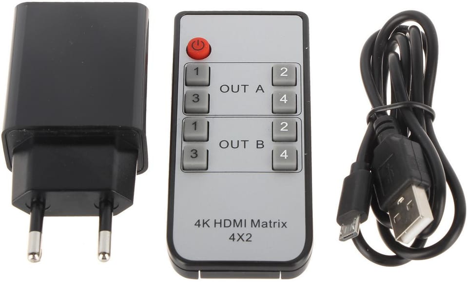 Allows any distribution of HDMI signal from 4 inputs to any 2 outputsThe set includes a remote control