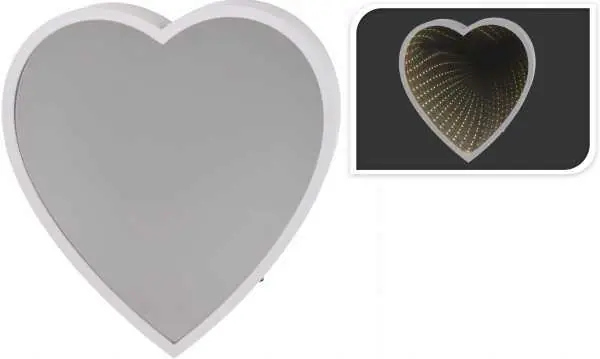 Heart-shaped mirror with infinite illumination 44LED 23 x 25 cm white Heart-shaped mirror has a light tunnel consisting of 44 LEDs. It looks perfect in all interiors. It gives an amazing aesthetic experience. A great idea for a Valentine's Day gift, but also a great one will work as a gift. Technical data: Lighting 44LED, Infinity effect, Dimensions:23x5x25cm, Color: white, Light color: warm white, Battery powered:3xAA (not included), On/ off, Back hanger, Material: plastic,