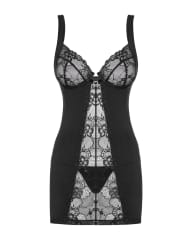 Uwodzicielska koszulka nocna wykonana z elastycznej tkaniny i pięknej, kwiecistej koronki. Z wyjątkowo atrakcyjnym dekoltem, który stanowią szerokie, ozdobne ramiączka w stylu Marylin i profilowane miseczki (w wersji soft) na fiszbinach. Piersi umiejętnie zebrane i podkreślone? - jak najbardziej! Przód (po środku) i tył z prześwitem, stringi w komplecie. Skład: 85% poliamid, 15% elastan.