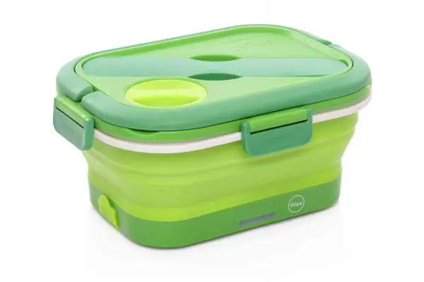 Heated silicone container, folding for food LunchBox Filux + additives. Heated food container for people who like to enjoy warm food anywhere and at any time. LunchBox can be connected to electricity using a 104 cm long power cord, with a plug to an electrical outlet 220 V - 230 V. Food is heated evenly and quite slowly, so there is no risk of burning or sticking to the food. The box has a lockable lid, so it can also be used to store food. An additional advantage of the container is the flexible silicone from which it was made. This allows it to be folded when it is empty. Folded takes up half as much space, making it easy to store and transport. LunchBox in the lid has an additional container, e.g. for spices and has an attached fork with a knife function and a spoon. The container also has two folding handles, thanks to which the box can be conveniently moved. The product is approved for contact with food. Recommended for solid meals, not for soups. The weight of the container without a lid is 300 g, with a lid it is 500 g. Carton dimensions: 6 cm /18 cm / 22 cm. Technical specification Maximum temp. heating approx. 70°C Height (unfolded) 9.5 cm Height (folded) 4.5 cm Capacity 1 L Additives spice container, fork, spoon, knife Power, power supply 35W, 220-240V, ~50Hz Easy storage Cutlery in the set Uniform heating Practical handles for carrying Containers for spices Lunchbox in numbers Container weight 300g / with lid 500g Max. temp up to 70°C Capacity 1 L Silicone This is a durable and practical material without harmful bisphenul - BPA. Functionality The container can be used to store, carry and heat food. Unique appearance Modern functional design, harmonious colors and refinement of details are the distinguishing feature of the Filux brand. High quality Modern materials, durable and hygienic, which are approved for contact with food. Safety of use The device is easy to use and meets the standards of European countries. Compact dimensions The device is ideal for home cooking. Not used easy to store due to small dimensions. Thanks to the silicone design, the bottom folds compactly into a harmonica and does not take up much space.