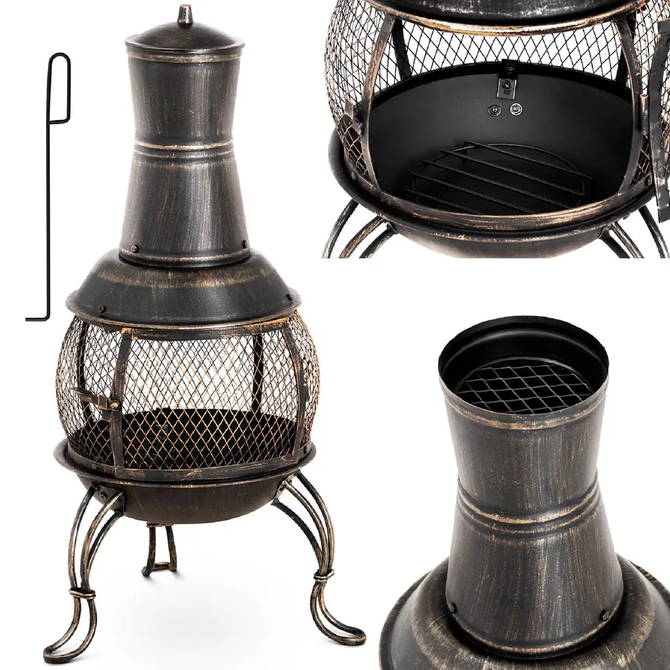 The furnace is made of steel, which evenly absorbs and distributes heat from the fire. The height of the stove is 90 cm. Various materials such as wood or charcoal can be used in the furnace. The burning material is placed on the grate, which causes the ash to separate during combustion. Thanks to the mesh housing, the fire is seen from each side, you can easily assess the amount of material left to burn and with the help of mesh doors add a larger amount of it.
