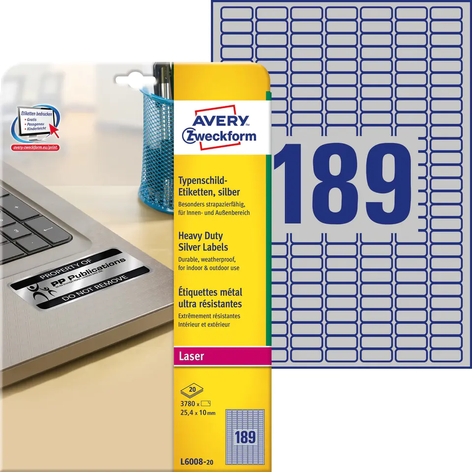 Heavy Duty Labels 25.4x10mm silver polyester L6008-20pcs AVERY ZWECKFORM