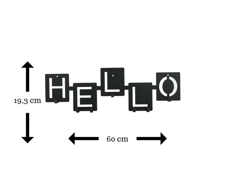 Hello wall hanger will work in any modern hallway, reception or hall. Precisely cut letters on unevenly placed squares create an interesting composition of shapes. Powder-coated metal is resistant to damage and dirt. Thanks to 7 hooks, with a maximum load of up to 3kg each, you can hang jackets, keys or even bags on it. The product is available in two colors. The maximum load on the strip is 21kg. A mounting kit is attached to the hanger, which consists of dowels, plugs and screws. Height: 23cm Width: 60cm Max. number of pieces in a carton:1 Carton dimensions: 25cm x 67cm x 4cm Package weight: 2kg