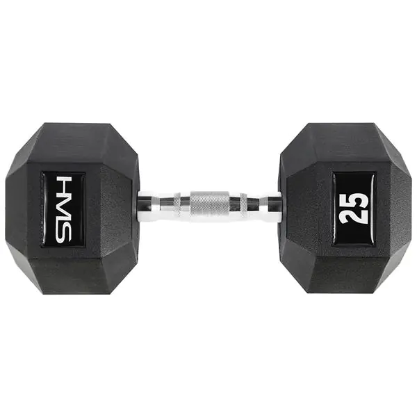 HEX PRO HMS - rubberized hexagonal dumbbells. Training using dumbbells from the HEX PRO HMS family allows you to duplicate almost all types of exercises that are performed with a barbell. At the same time, they give the opportunity to work asymmetrically - using only one arm. Rubberized dumbbells are resistant to impact, have an ergonomic shape. In turn, a firm grip is guaranteed by a knurled handle. HEX PRO dumbbells are available in many weight versions, making them an ideal solution for both people who are just starting their adventure with strength training, as well as for those more advanced. Specification: Material: rubber plated steel Handle: knurled Gripping part length: 110 mm Overall length: 420 mm Load diameter: 153 mm Notes: 24 months warranty
