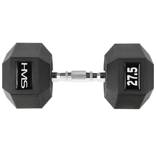 HEX PRO HMS - rubberized hexagonal dumbbells. Training using dumbbells from the HEX PRO HMS family allows you to duplicate almost all types of exercises that are performed with a barbell. At the same time, they give the opportunity to work asymmetrically - using only one arm. Rubberized dumbbells are resistant to impact, have an ergonomic shape. In turn, a firm grip is guaranteed by a knurled handle. HEX PRO dumbbells are available in many weight versions, making them an ideal solution for both people who are just starting their adventure with strength training, as well as for those more advanced. Specification: Material: rubber plated steel Handle: knurled Gripping part length: 110 mm Overall length: 380 mm Load diameter: 165 mm Notes: 24 months warranty