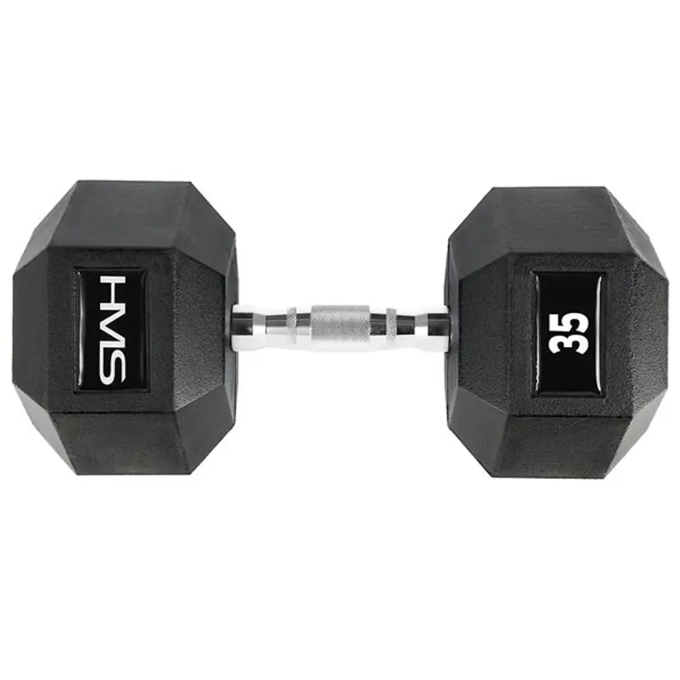 HEX PRO HMS - rubberized hexagonal dumbbells. Training using dumbbells from the HEX PRO HMS family allows you to duplicate almost all types of exercises that are performed with a barbell. At the same time, they give the opportunity to work asymmetrically - using only one arm. Rubberized dumbbells are resistant to impact, have an ergonomic shape. In turn, a firm grip is guaranteed by a knurled handle. HEX PRO dumbbells are available in many weight versions, making them an ideal solution for both people who are just starting their adventure with strength training, as well as for those more advanced. Specification: Material: rubber plated steel Handle: knurled Gripping part length: 110 mm Overall length: 401 mm Load diameter: 180 mm Notes: 24 months warranty