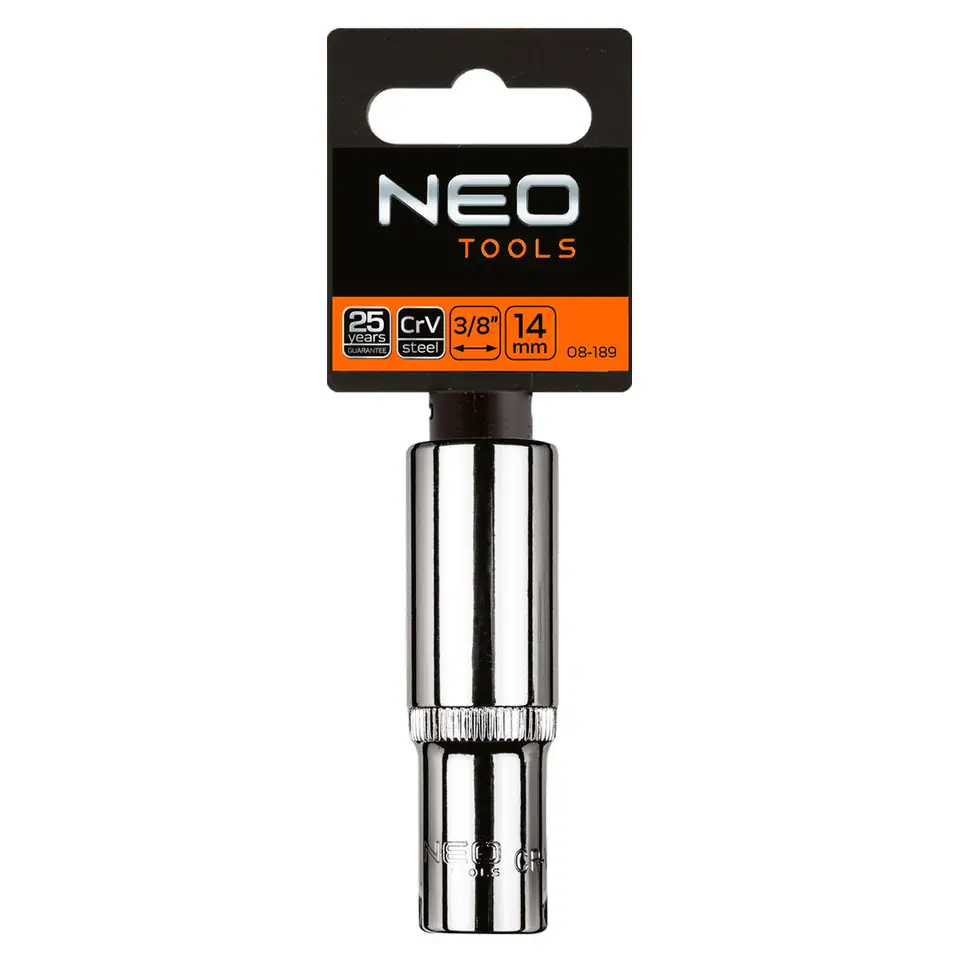 Hexagonal socket long 3/8" 17 mm NEO (ref. 08-192) made of durable chrome-vanadium steel. The knurled surface improves the grip of the cap. The quality of the tool is confirmed by a 25-year manufacturer's warranty. The NEO brand meets the expectations of professionals.