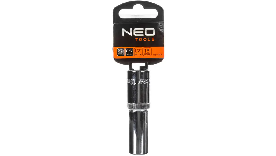 Hexagonal socket long 1/2" 13 mm NEO (ref. no. 08-463) made of durable chrome-vanadium steel. The knurled surface improves the grip of the cap. The quality of the tool is confirmed by a 25-year manufacturer's warranty. The NEO brand meets the expectations of professionals.