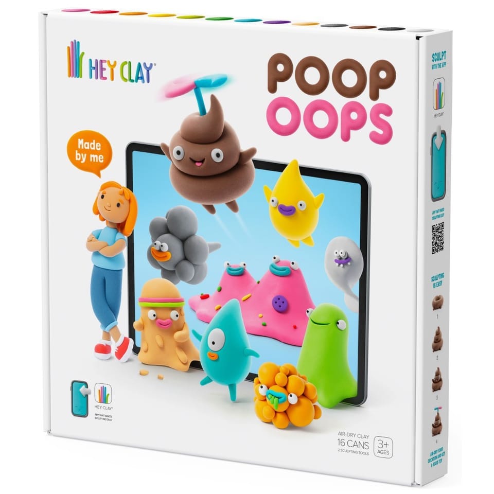 The Hey Clay set contains 16 containers of soft, scented, creative paste and an app access code for purchasing the character series. The clothespins shown on the pack, allow you to create all 9 characters from the POOP OOPS set (poop, pee, wax, vomit, snot, teardrop, dandruff, blubber, sweat).