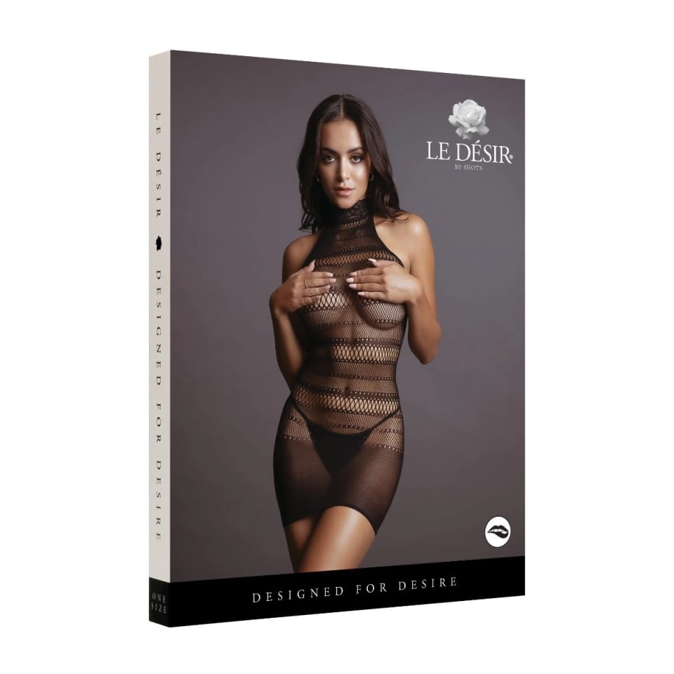 High neck mini dress with lace-pattern border and striped pattern. This dress has some stretch and can be worn from size S to L.Hand wash or hand wash programme, cold water, dry flat, do not tumble dry, do not iron