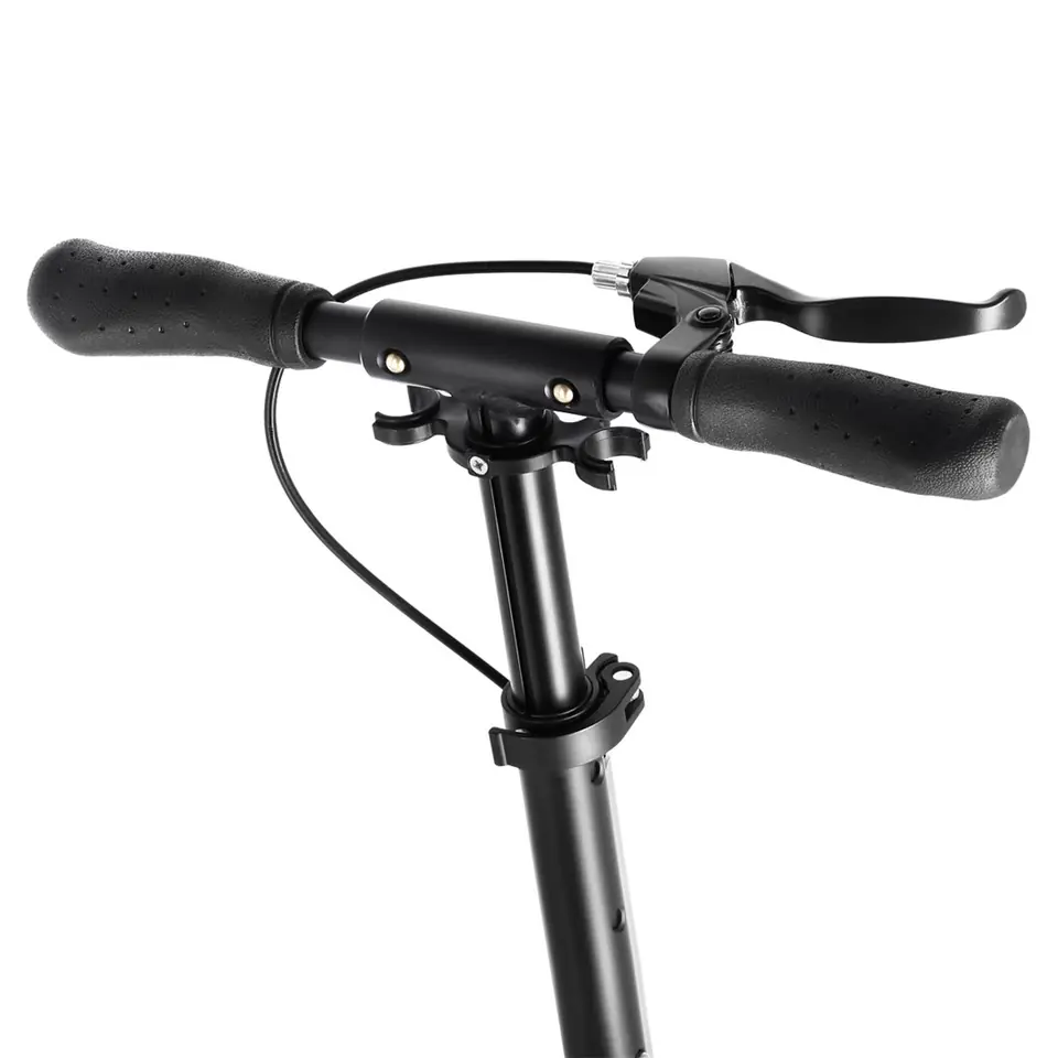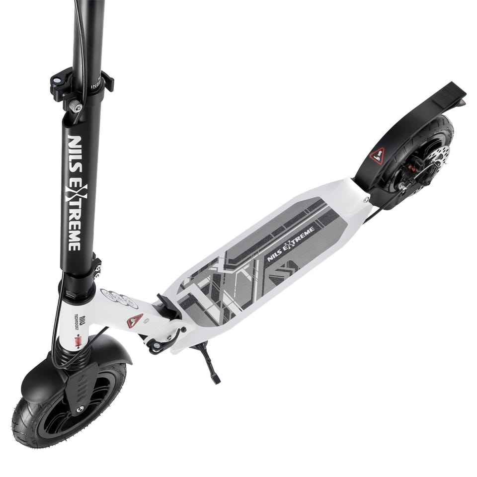 HM208T Nils Extreme is a scooter designed for children, teenagers and adults. A characteristic feature of the Nils Extreme brand product are two shock absorbers - front vertical and rear horizontal. They provide greater comfort while driving, minimize vibrations and absorb shocks. Thanks to this, the product will work very well when moving on uneven surfaces. The scooter is made of aluminum, thanks to which it is very light and durable. The steering wheel is equipped with rubber covered handles, which provides a firm grip and does not cause abrasions. Large ABEC9 wheels and bearings increase stability and smoothness. In addition, the wheels are inflated, which significantly broadens horizons relative to the surface on which we can move. Uneven terrain will not be a problem. The scooter has an additional manual disc brake located on the rear wheel. Thanks to it, we get a much higher braking force than in the case of a classic foot brake. Placing it on the steering wheel makes it much more intuitive than the foot brake, and it is also much faster to use. And most importantly, the use of such a solution results in driving safety, even on wet roads. Additionally mounted fenders prevent splashing. HM208T, will be perfect for asphalt surfaces as well as off-road. Specification: Material: Aluminum Platform material type: Aluminum Bearings: ABEC9 Wheels: 200 mm inflatable Equipped with disc brake Foldable: yes Foot: yes Dimensions unfolded: Length: 96 cm Width: 40 cm Height: 82 – 105 cm Dimensions after folding: Length: 86 cm Width: 13 cm Height 32 cm Platform dimensions: Length: 34 cm Width: 13cm Maximum user weight: 100kg Weight: 5.5 kg Notes: Not intended for commercial use Complies with PN-EN 14619:2015 Warranty 24 months