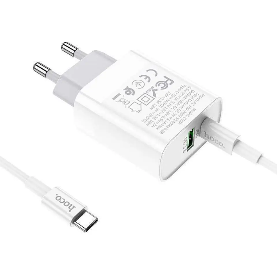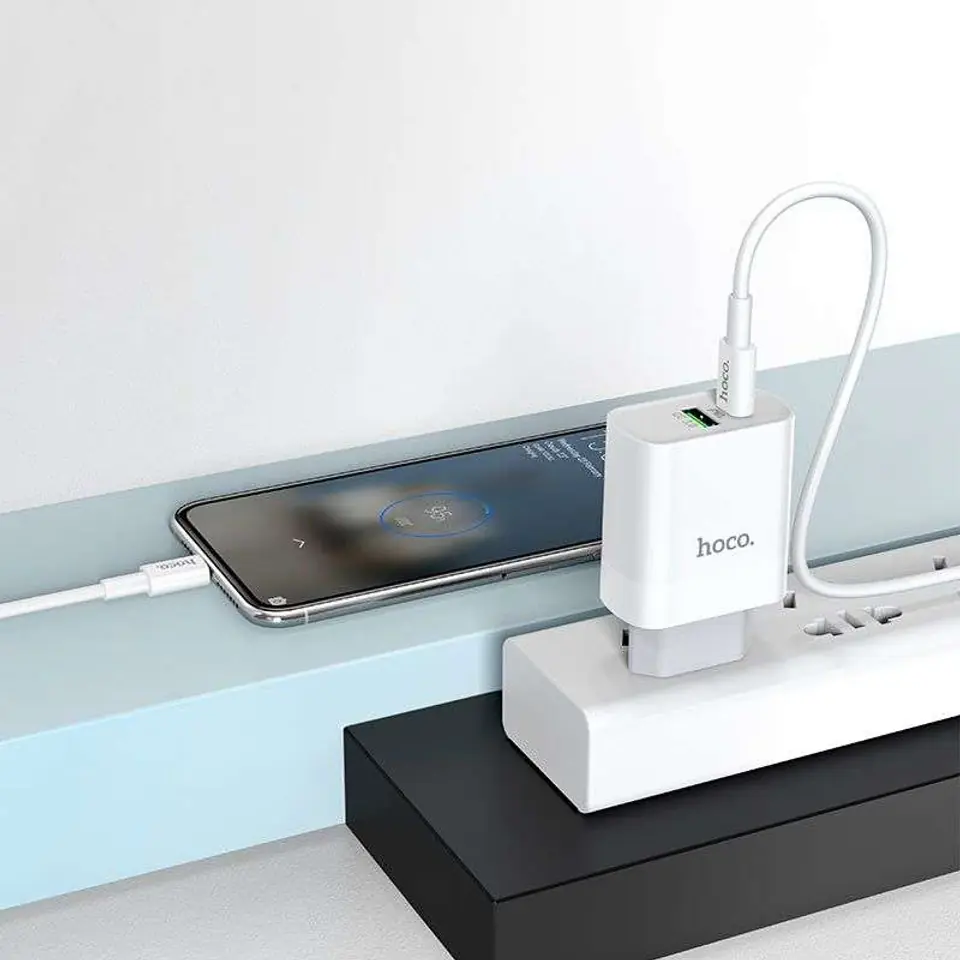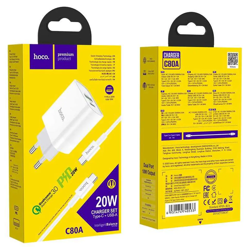 The Hoco C80A wall charger is a compact device equipped with 2 ports: USB Type-C with PowerDelivery standard and standard USB with a total power of 20W.
