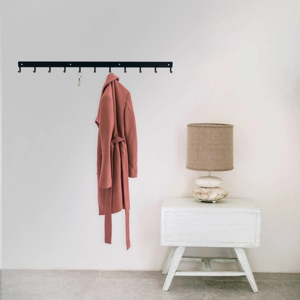 Listwa hakowa to doskonałe rozwiązanie do przedpokoju lub poczekalni. Nowoczesny stalowy wieszak posiada aż 11 haczyków o maksymalnym obciążeniu 3kg każdy. Dzięki wycinanym laserowo, a zarazem wytrzymałym, haczykom listwa jest idealna do przechowywania na niej torebek, kluczy lub odzieży. Produkt jest malowany proszkowo co za tym idzie jest łatwy w czyszczeniu oraz odporny na zarysowania. Dodatkową zaletą jest matowe wykończenie które dodaje klasy oraz elegancji. Listwa hakowa jest dostępna w dwóch kolorach dzięki czemu mamy więcej możliwości aranżacji wnętrza. Maksymalne obciążenie listwy to 33kg. Do wieszaka załączany jest zestaw montażowy, który składa się z kołków, zaślepek i śrubek. Wysokość: 5,5cm Szerokość: 80cm Max. ilość sztuk w kartonie:1 Wymiary kartonu:9cm x 80cm x 5cm Waga opakowania: 2kg
