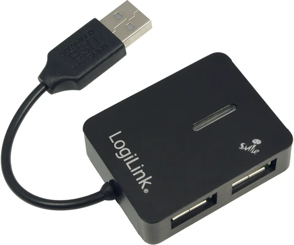 USB 2.0 Hub 4-Port Smile to USB Hub in Logilink in black with code UA0139. This is a universal USB 2.0 hub with 4 passive USB ports. The USB connector standard allows for data transfer speeds of up to 480 Mb/s and for cooperation with USB 1.1 devices with data transfer rates of up to 12 Mb/s. The product is equipped with a signaling LED informing about the operation of the device, as well as overload protection. The hub works with Windows XP/Vista/7 and Mac OS 8.6 and higher. The product supports Plug & Play and Hot Plug technology.