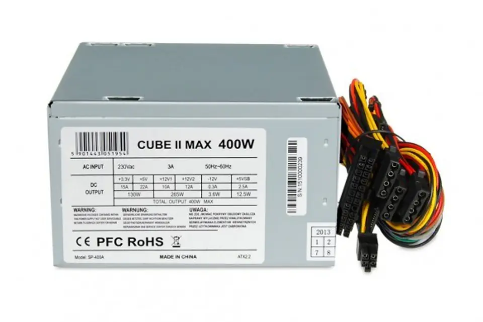 ATX 2.2 power supply 400W. A large number of protections, including: UVP (undervoltage) / OVP (overvoltage) / SCP (short-circuit) / OPP (overload) / OCP (overcurrent) / OTP (thermal) and AFC (automatic fan speed control). It has a detachable power plug (20 + 4) enabling connection to the main boards with 20-pin and 24-pin power supply.
