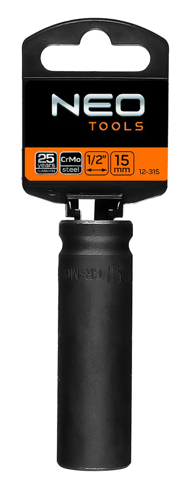 Impact socket 15 mm long, 1/2" NEO (ref. 12-315). Made of durable chrome-molybdenum steel. The thickened walls of the cap guarantee its high strength. The longer length of the cap allows access to deep screw sockets. The NEO brand meets the expectations of professionals.