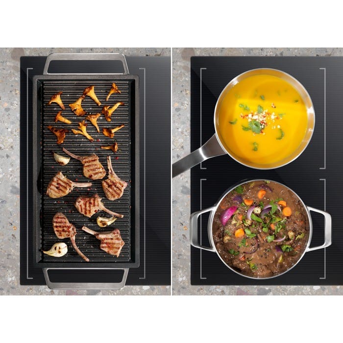 The Bridge function allows you to combine two cooking zones into one large cooking surface. Thanks to automatic synchronization of temperature and time settings, it is ideal for using plancha grill plates and baking dishes.