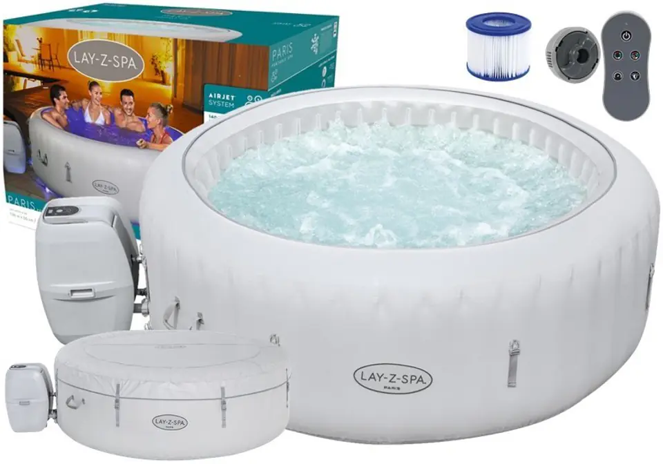 A garden pool is not enough? You can already enjoy luxury at home by purchasing a jacuzzi with a water heater. The Lay-Z inflatable Jacuzzi by Bestway model Paris is a one-of-a-kind SPA that you can have in your home garden or home Even on colder days, you can jump into the hot water. This bubble pool is a refreshment and an amazing rest. The tank is characterized by thick, inflatable walls. When using the jacuzzi, they will be a comfortable support for you and your loved ones. This inflatable Spa can accommodate up to 6 people. The AirJet system includes 140 nozzles that release bubbles from the bottom of the spa pool, creating a warm, bubbling environment. These soothing bubbles will help you relax and unwind from the comfort of your own home. A soft insulated floor will increase the comfort of using the jacuzzi and ensure that the water does not cool down from the ground.