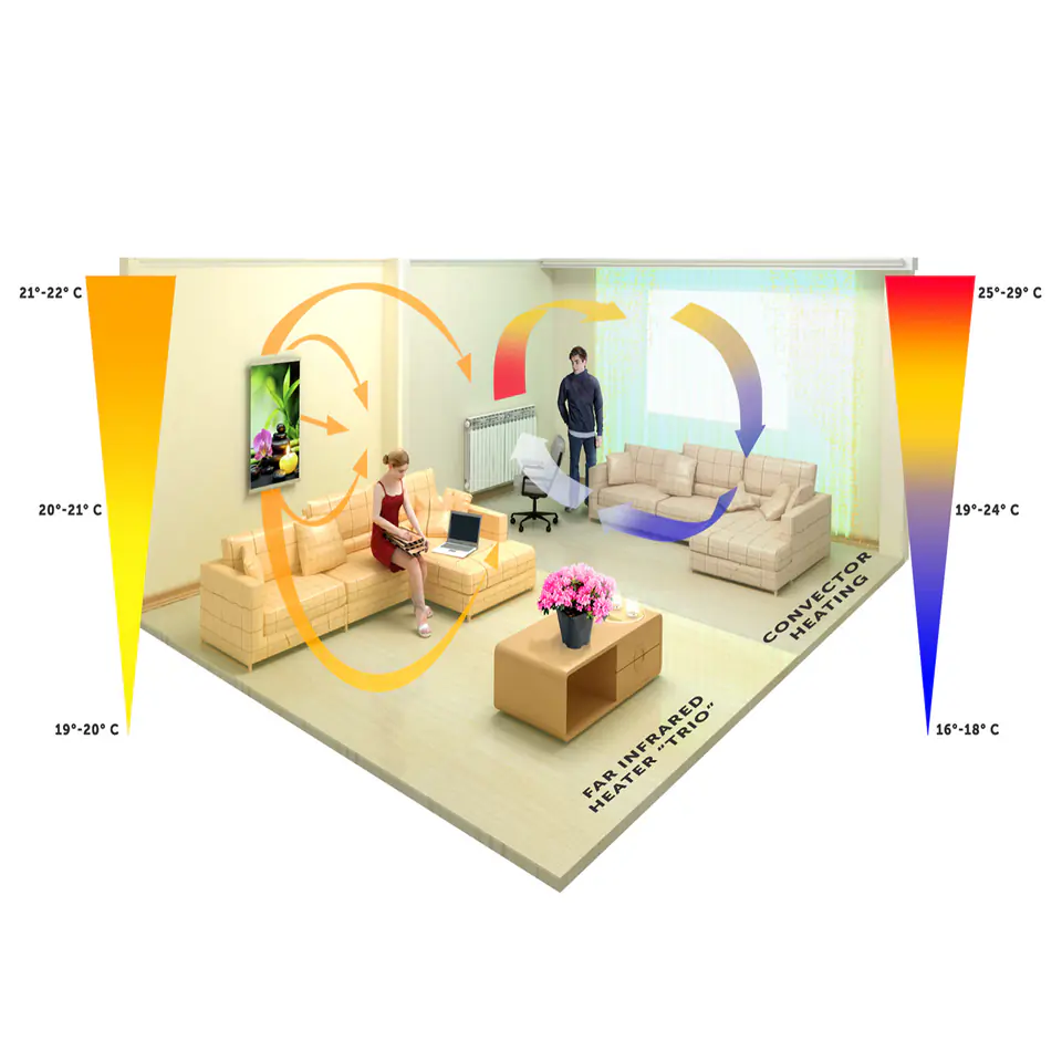 The heater provides warmth and thermal comfort in the room. This effect is achieved due to the long infrared waves that are created when heating the carbon fiber. Carbon fiber has a high thermal conductivity, which allows you to reduce power consumption and thus save on heating. During operation, the heater does not heat the air itself, but warms the surrounding objects and the human body (improves blood circulation in the body).
