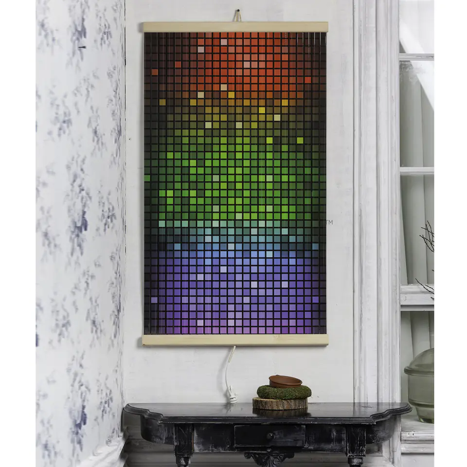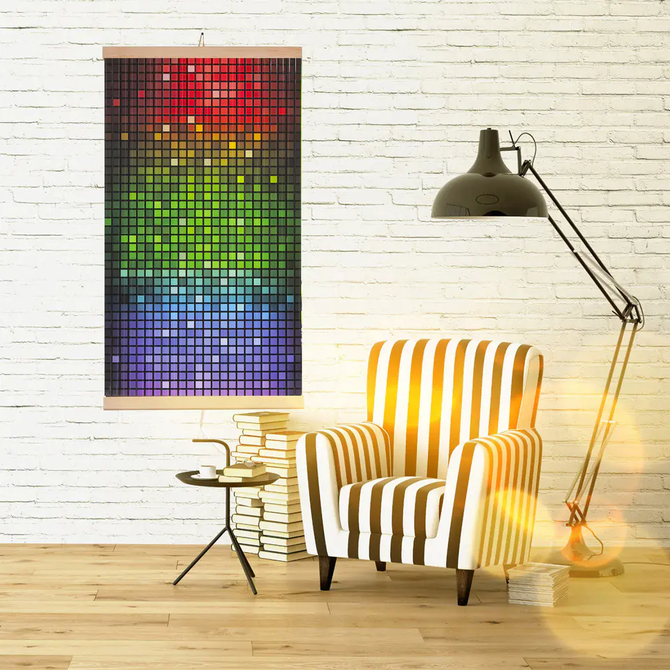 The main part of the radiator is made of bending and breaking resistant polymer heating film, on which graphics with a pattern are applied. The whole is fastened with wooden slats.