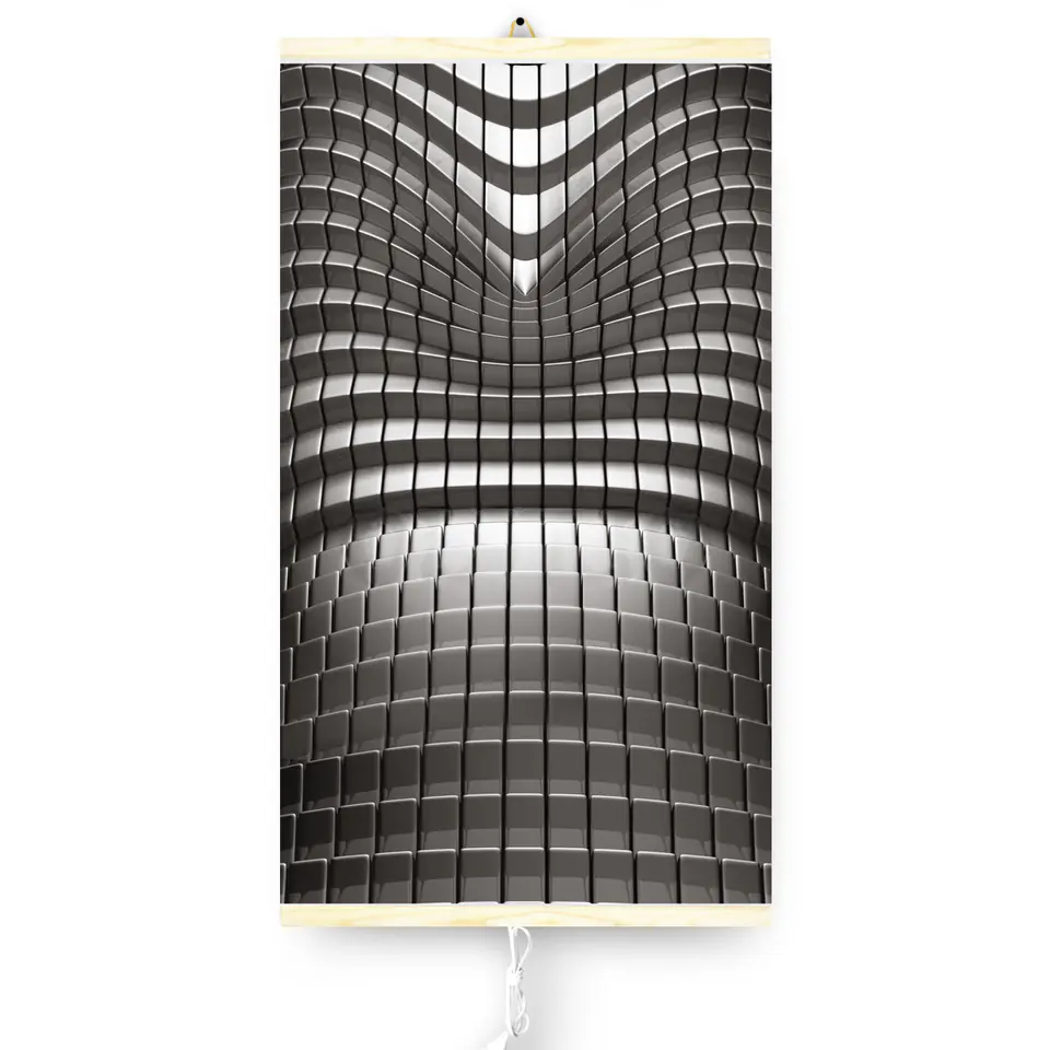 The main part of the radiator is made of bending and breaking resistant polymer heating film, on which graphics with a pattern are applied. The whole is fastened with wooden slats.