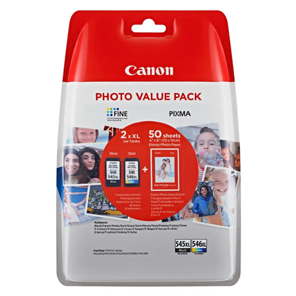 Savings package for convenient printing. The package includes a 545XL black ink tank with a capacity of 15 ml, a 546XL color ink tank with a capacity of 13 ml and 50 sheets of Glossy Photo Paper in 4" x 6" format for the PIXMA printer. Allows you to print up to 400 pages of A4 documents in black or 300 pages of A4 documents in color, in accordance with the ISO/IEC 24711 standard.
