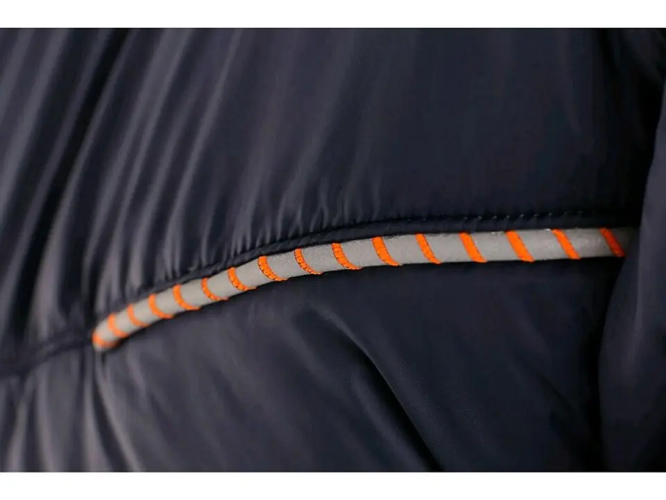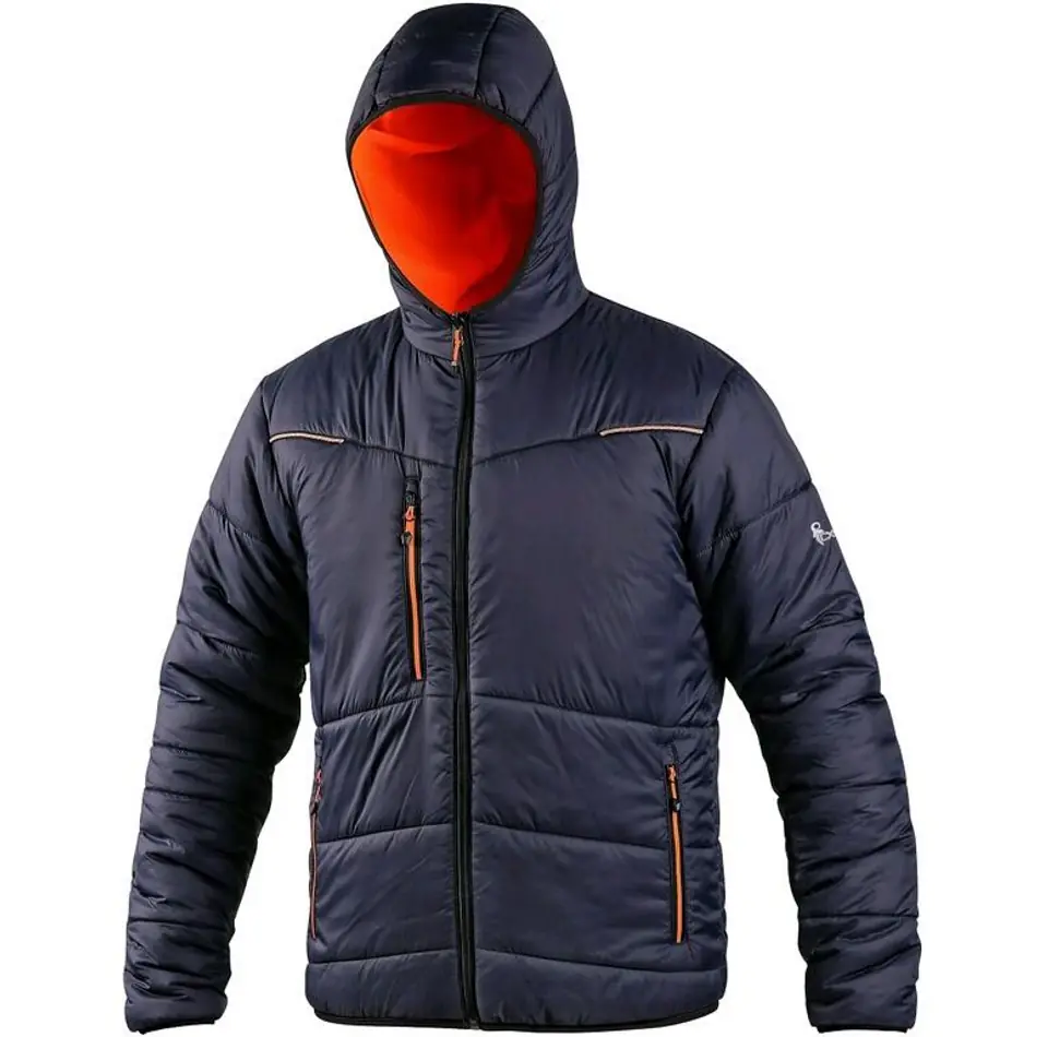 Men's double-sided insulated warning jacket. Non-detachable hood, sleeve cuff and lower hem in elastic band. Outer part: zippered chest pockets, side zippered pockets and segmented reflective stripes. Inner part: zippered chest pocket, side zippered pockets, contrasting yellow/orange and reflective elements. Recommended application: construction, road works, drivers, air and sea transport, logistics, truck drivers, police.