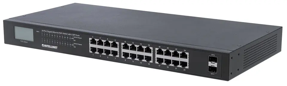 Intellinet 24-Port Gigabit Ethernet PoE+ Switch with 2 SFP Ports, LCD Display, IEEE 802.3at/af Power over Ethernet (PoE+/PoE) Compliant, 370 W, Endspan, 19" Rackmount