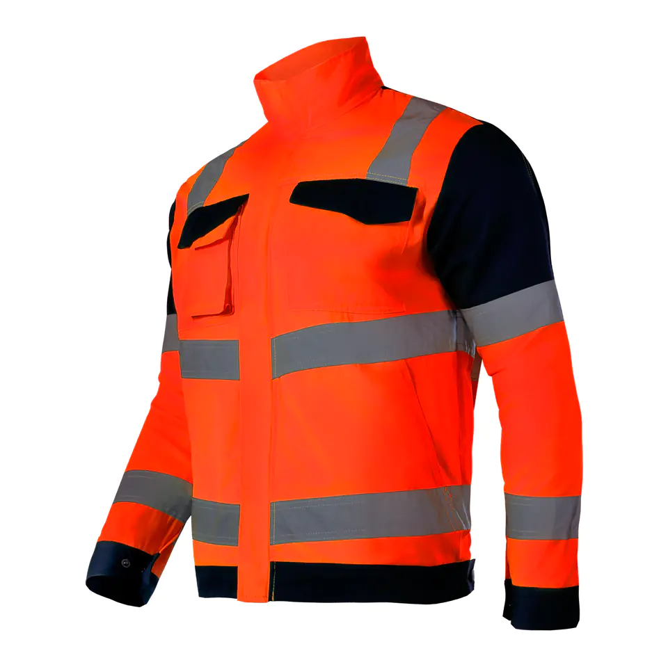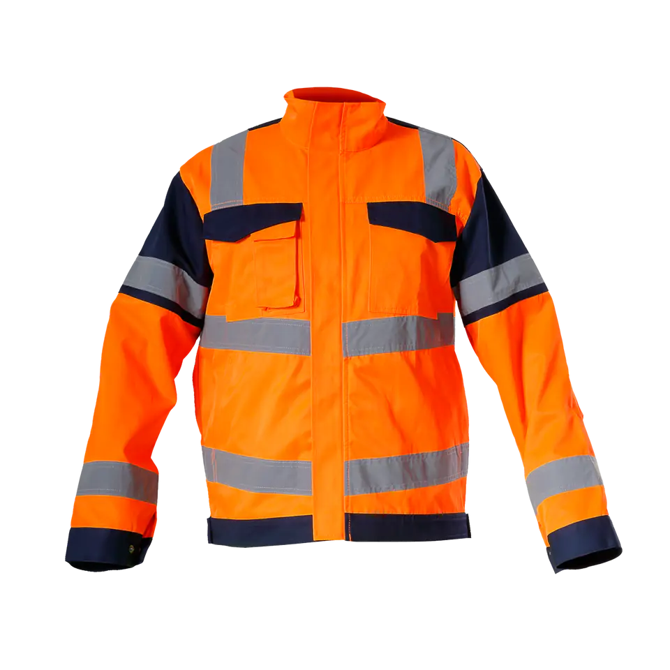 - Reflective stripes in accordance with EN ISO 20471. High visibility class: class 2. Double seams. Zipper. Cuffs fastened with press studs with the possibility of adjustment. Width adjustment at the bottom of the jacket with the help of naps. Press studs covered with plastic protecting against contact with water. 7 pockets, including 3 fastened with velcro. Mobile phone pocket. Identification tab.