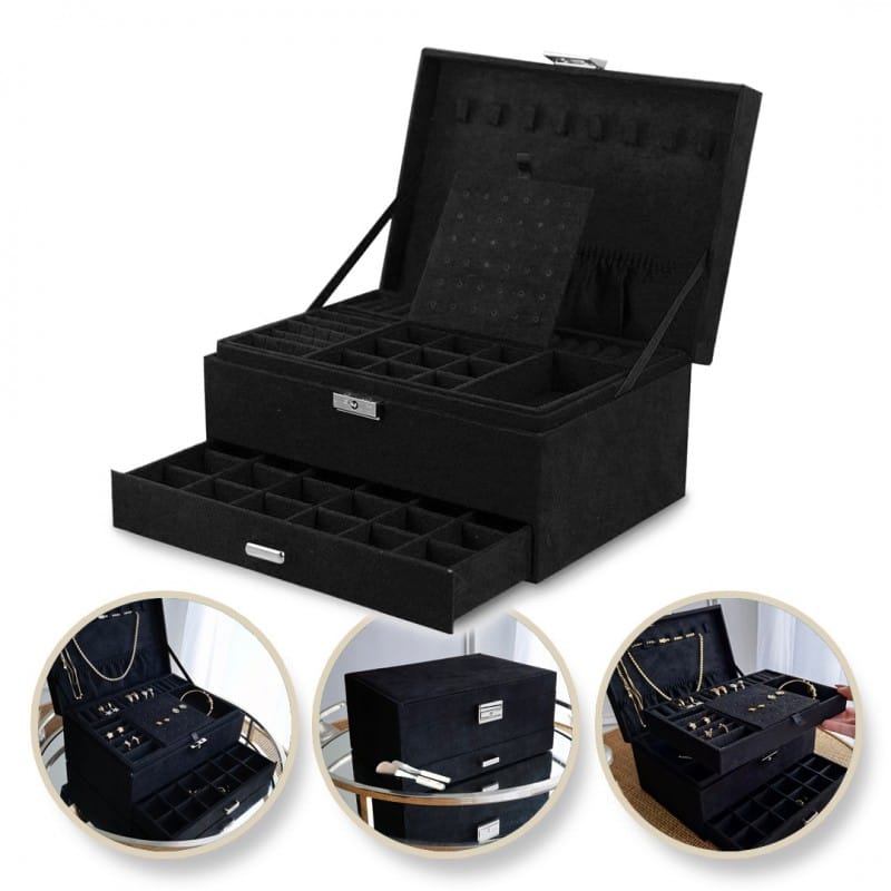 Very elegant and wonderfully presented case in a beautiful black colorIts functionality, a large number of drawers and compartments has been hidden in an economical shape designed to perfectly match modern interiors and retro-stylized. It is extremely practical, you can organize and protect a very large amount of jewelry from damage. There will be rings, earrings and necklaces. Product features:- High quality materials used for production is a guarantee of quality- Very functional - allows you to conveniently store a large amount of jewelry in one place in an orderly way- It has a solid metal zipper- Covered with an elegant material imitating suede - The center is filled with soft velour materialExternal dimensions:Height - 11,5 cmWidth - 24 cmDepth - 17 cm