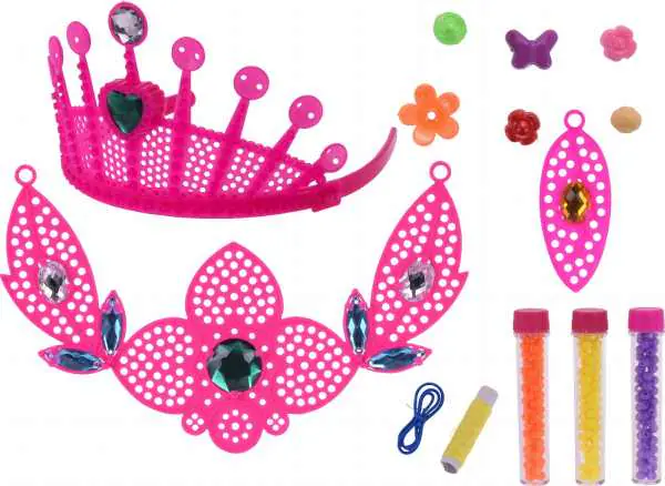 Jewelry Maker 13 Accessories + Pink Crown The set includes everything you need to make a beautiful wreath. Super fun to wear or give as a gift. Specifications: Set includes: 1 crown, 1band, 11 pearls in different colors, Crown color: pink, Color: multicolored, Gender: girls, Material:Plastic. ,