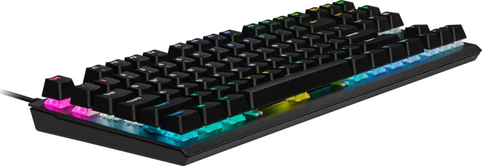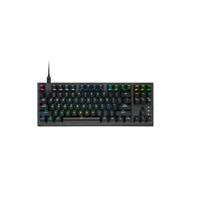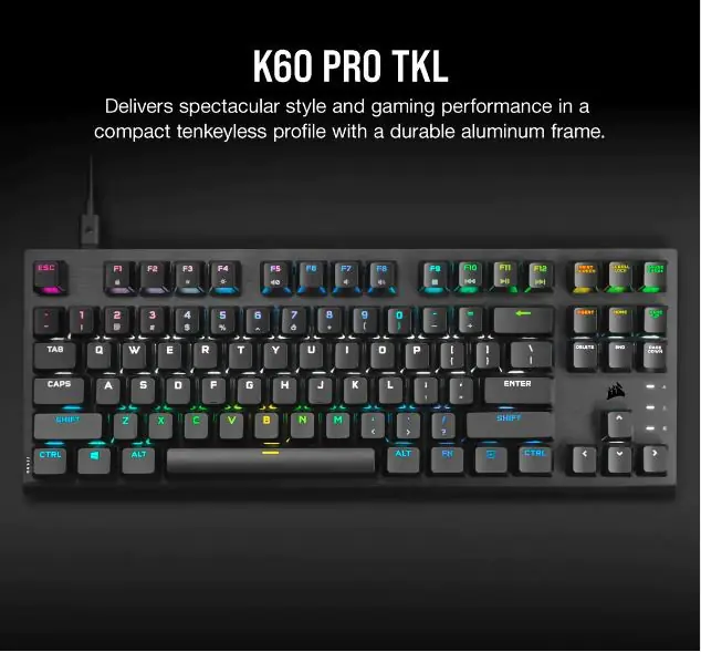 The CORSAIR K60 PRO TKL RGB optical-mechanical gaming keyboard without Tenkey keys delivers compact design and performance with CORSAIR OPX optical-mechanical key switches and a durable brushed aluminum frame.