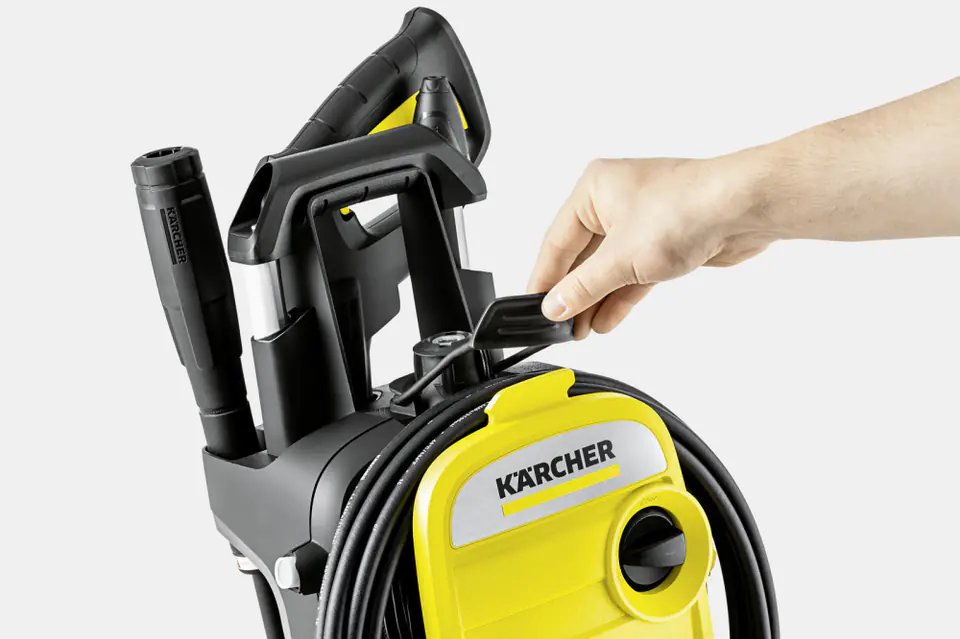 Wąż wysokociśnieniowy po zakończonej pracy można zwinąć i zamocować elastycznym paskiem.