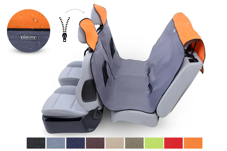 Kardimata Activ – version with zipper – waterproof cover with PROTECTIVE CAPS FOR HEADRESTS and POCKETS for accessories. The version with a lock allows you to simultaneously transport the dog with the passenger (just unfasten the lock from one headrest and unfasten the buckle from the headrest). Kardimata is designed especially for dogs of large breeds that occupy the entire rear seat or for several dogs of smaller breeds.