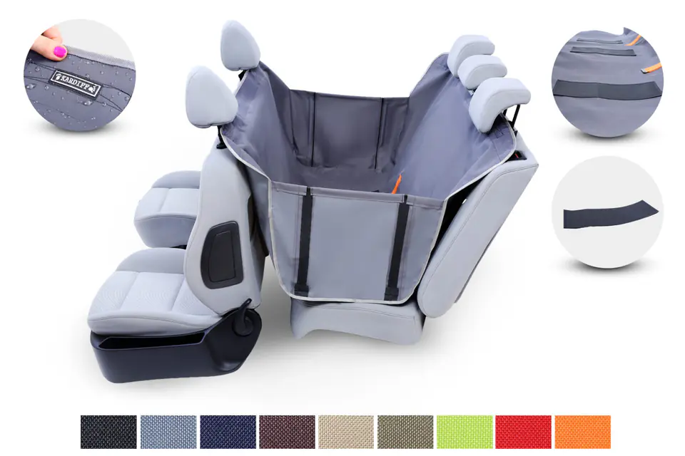 Kardimata ANTI SLIP – protective mat cover for rear seats. It protects the car and upholstery from the coat with dirt water and scratches. It has two lockable holes for seat belts. Special Anti-slips make it easier for dogs to maintain balance and prevent them from sliding, making the journey even safer and more comfortable.