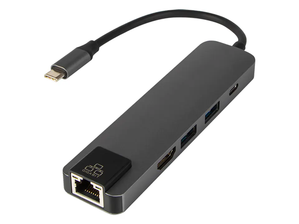External network card with USB-C plug and RJ45, HDMI, USB Type-C and two USB 3.0 ports designed primarily for Apple notebooks (MacBook series), Chromebook and laptops with USB-C input. The high-quality adapter allows you to quickly connect to the Internet via the RJ45 network cable and connect various types of external devices that match the mounted sockets.